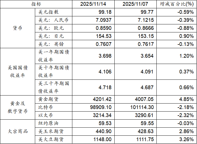 11月7日至11月14日,美元指数下跌0.59%,美元兑人民币汇率下跌0.30%。美国一年期、十年期及三十年期国债收益率均呈现上涨态势。黄金期货价格上涨4.85%。比特币下跌2.18%。以太币下跌2.32%。大宗商品中纽约原油价格下跌,而玉米期货及大豆期货价格则呈现上涨态势。