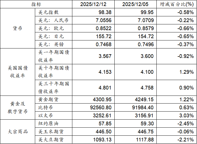 12月05日至12月12日,美元指数下跌0.58%,美元兑人民币汇率下跌0.22%。美国一年期国债收益率下跌,而十年期及三十年期国债收益率呈现上涨态势。黄金期货价格上涨1.22%。比特币上涨0.63%。以太币上涨3.03%。大宗商品中纽约原油、玉米期货及大豆期货价格均呈现下跌态势。
