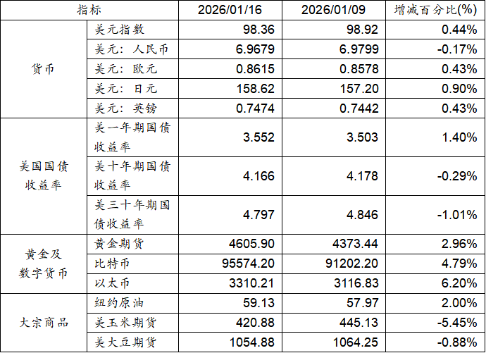 1月9日至1月16日,美元指数上涨0.44%,美元兑人民币汇率下跌0.17%。美国一年期国债收益率上涨,而十年期及三十年期国债收益率则实现下跌。黄金期货价格上涨2.96%。比特币上涨4.79%。以太币上涨6.20%。大宗商品中纽约原油价格上涨,而玉米期货及大豆期货价格则呈现下跌态势。