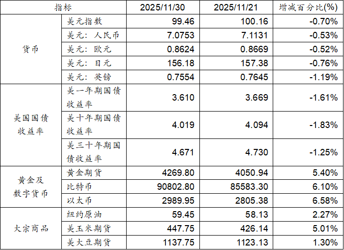 11月21日至11月30日,美元指数下跌0.70%,美元兑人民币汇率下跌0.53%。美国一年期、十年期及三十年期国债收益率均下跌。黄金期货价格上涨5.40%。比特币上涨6.10%。以太币上涨6.58%。大宗商品中纽约原油、玉米期货及大豆期货价格均呈现上涨态势。