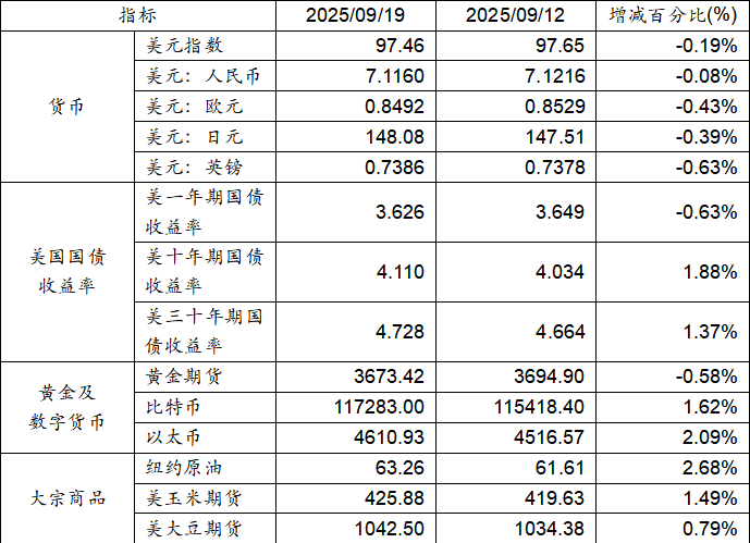 9月12日至9月19日,美元指数下跌0.19%,美元兑人民币汇率下跌0.08%。美国一年期国债收益率下跌,而十年期及三十年期国债收益率则呈现上涨态势。黄金期货价格下跌0.58%。比特币上涨1.62%。以太币上涨2.09%。大宗商品中纽约原油、大豆期货及玉米期货价格均呈现上涨态势。