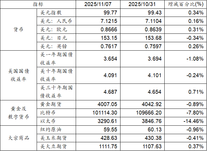 10月31日至11月7日,美元指数上涨0.34%,美元兑人民币汇率上涨0.16%。美国一年期及十年期国债收益率下跌,而三十年期国债收益率则呈现上涨态势。黄金期货价格下跌0.89%。比特币下跌7.80%。以太币下跌14.46%。大宗商品中纽约原油及玉米期货价格下跌,而大豆期货价格呈现上涨态势。