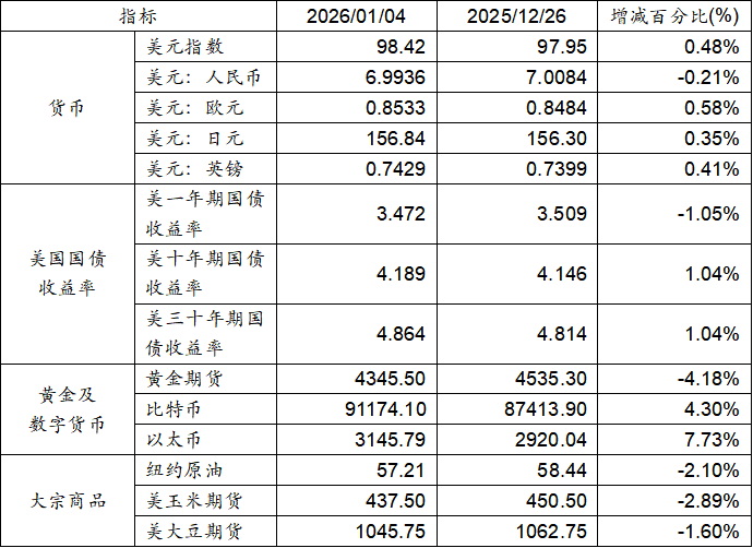 2025年12月26日至2026年1月4日,美元指数上涨0.48%,美元兑人民币汇率下跌0.21%。美国一年期国债收益率下跌,而十年期及三十年期国债收益率则实现上涨。黄金期货价格下跌4.18%。比特币上涨4.30%。以太上涨7.73%。大宗商品中纽约原油、玉米期货及大豆期货价格均呈现下跌态势。