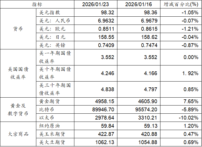 1月16日至1月23日,美元指数上涨0.44%,美元兑人民币汇率下跌0.07%。美国十年期及三十年期国债收益率均实现上涨。黄金期货价格上涨7.65%。比特币下跌5.89%。以太币下跌10.02%。大宗商品中纽约原油、玉米期货及大豆期货价格均呈现上升态势。