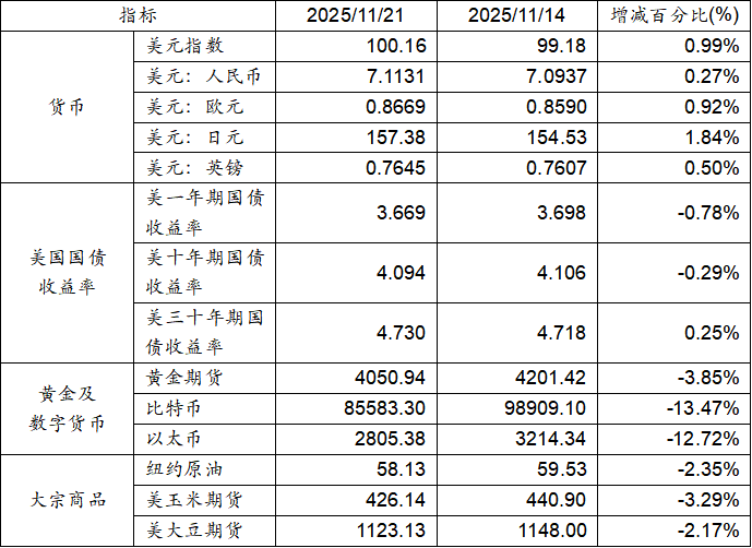 11月14日至11月21日,美元指数上涨0.99%,美元兑人民币汇率上涨0.27%。美国一年期及十年期国债收益率下跌,而三十年期国债收益率呈现上涨态势。黄金期货价格下跌3.85%。比特币下跌13.47%。以太币下跌12.72%。大宗商品中纽约原油、玉米期货及大豆期货价格均呈现下跌态势。