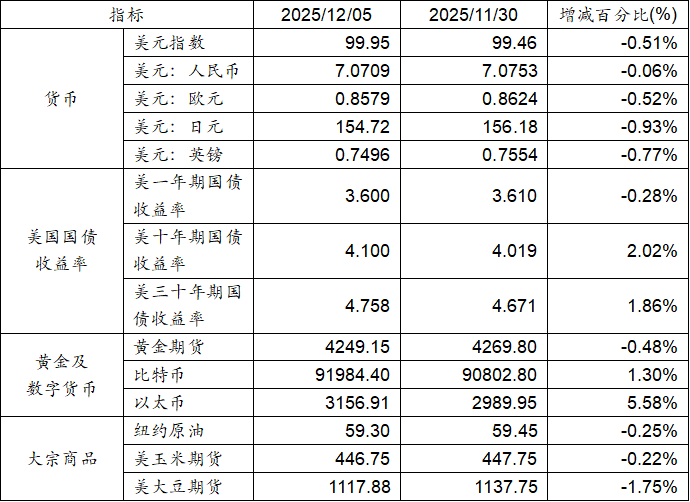 11月30日至12月05日,美元指数下跌0.51%,美元兑人民币汇率下跌0.06%。美国一年期国债收益率下跌,而十年期及三十年期国债收益率呈现上涨态势。黄金期货价格下跌0.48%。比特币上涨1.30%。以太币上涨5.58%。大宗商品中纽约原油、玉米期货及大豆期货价格均呈现下跌态势