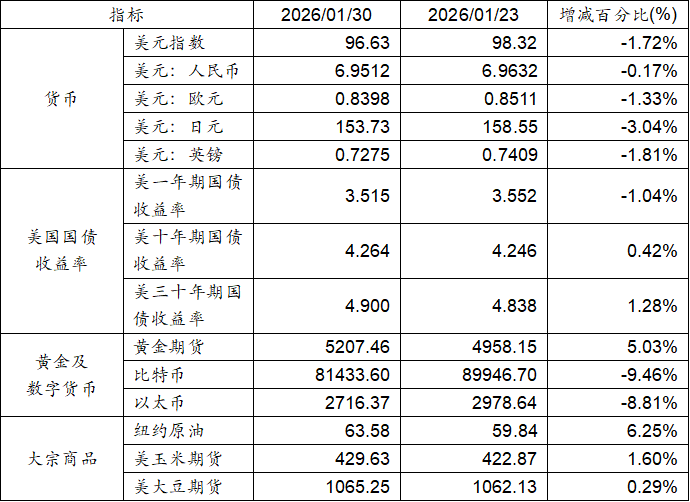 1月23至1月30日,美元指数下跌1.72%,美元兑人民币汇率下跌0.17%。美国十年期国债收益率下跌,而十年期及三十年期国债收益率则实现上涨。黄金期货价格上涨5.03%。比特币下跌9.46%。以太币下跌8.81%。大宗商品中纽约原油、玉米期货及大豆期货价格均呈现上升态势。