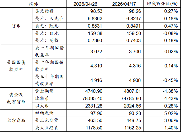 4月17日至4月26日,美元指数上涨0.27%,美元兑人民币汇率上涨0.18%。美国一年期、十年期及三十年期国债收益率均有所下跌。黄金期货价格下跌1.38%。比特币上涨 4.43%。以太币上涨 0.28%。大宗商品中纽约原油、玉米期货和大豆期货价格均呈现上涨态势。